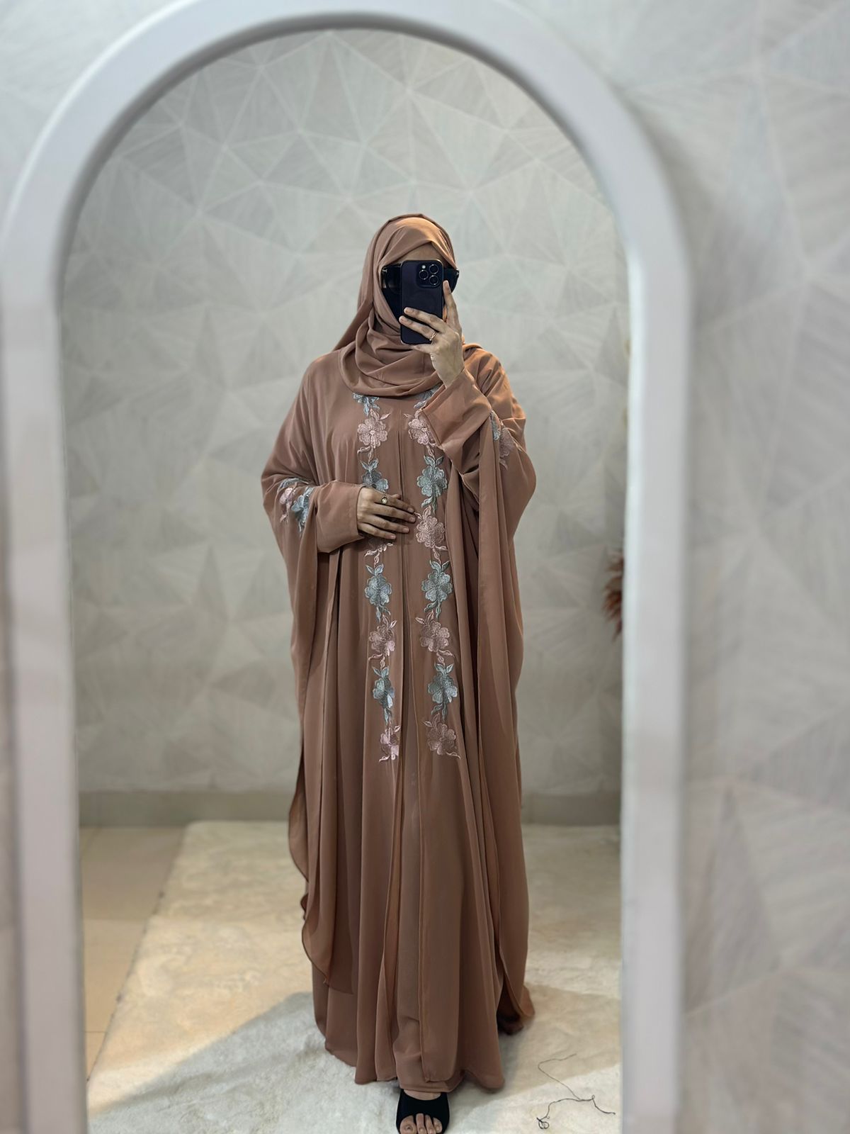 - Embroidered Sleeves: The abaya features intricately embroidered sleeves, offering a refined and elegant touch suitable for any occasion.