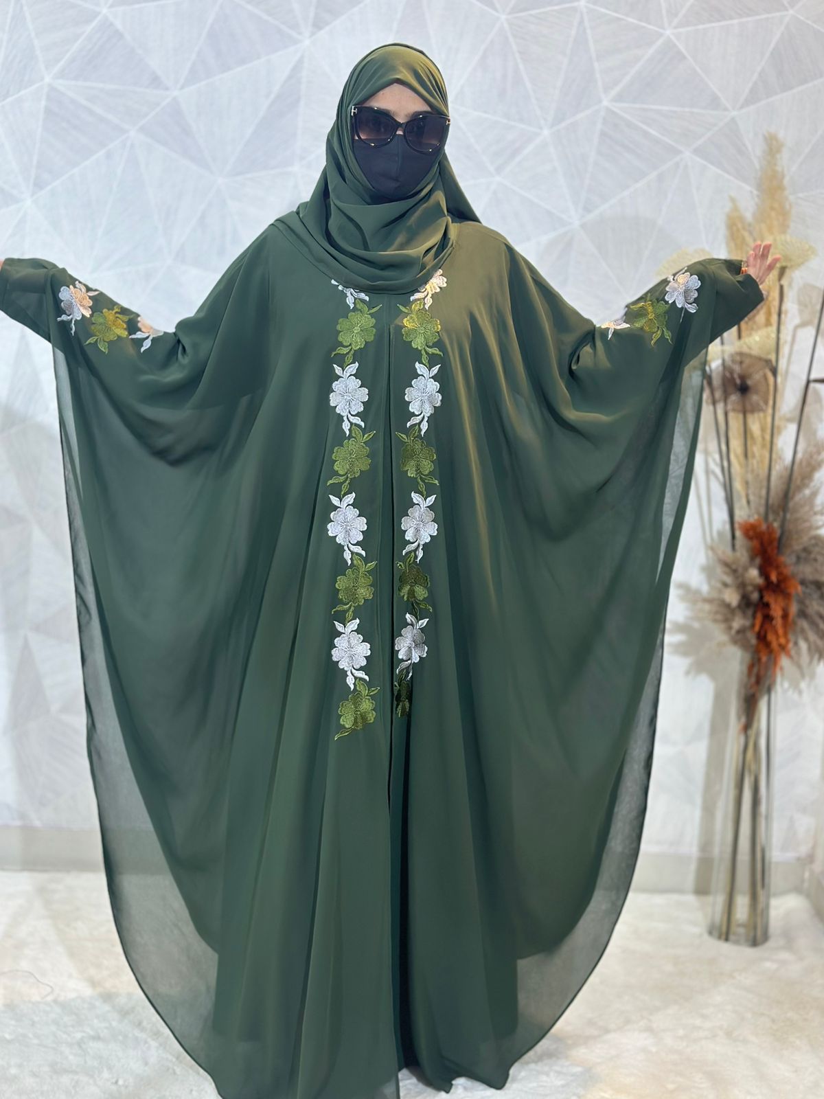 Discover the sophisticated charm of our Green Abaya Burqa, crafted from premium Indonesian Heavy Diamond Chiffon. This elegant piece blends floral embroidery with the iconic Dubai style, offering a timeless addition to your modest wardrobe. Embrace luxury and grace with this meticulously designed abaya, perfect for enhancing your modest fashion.