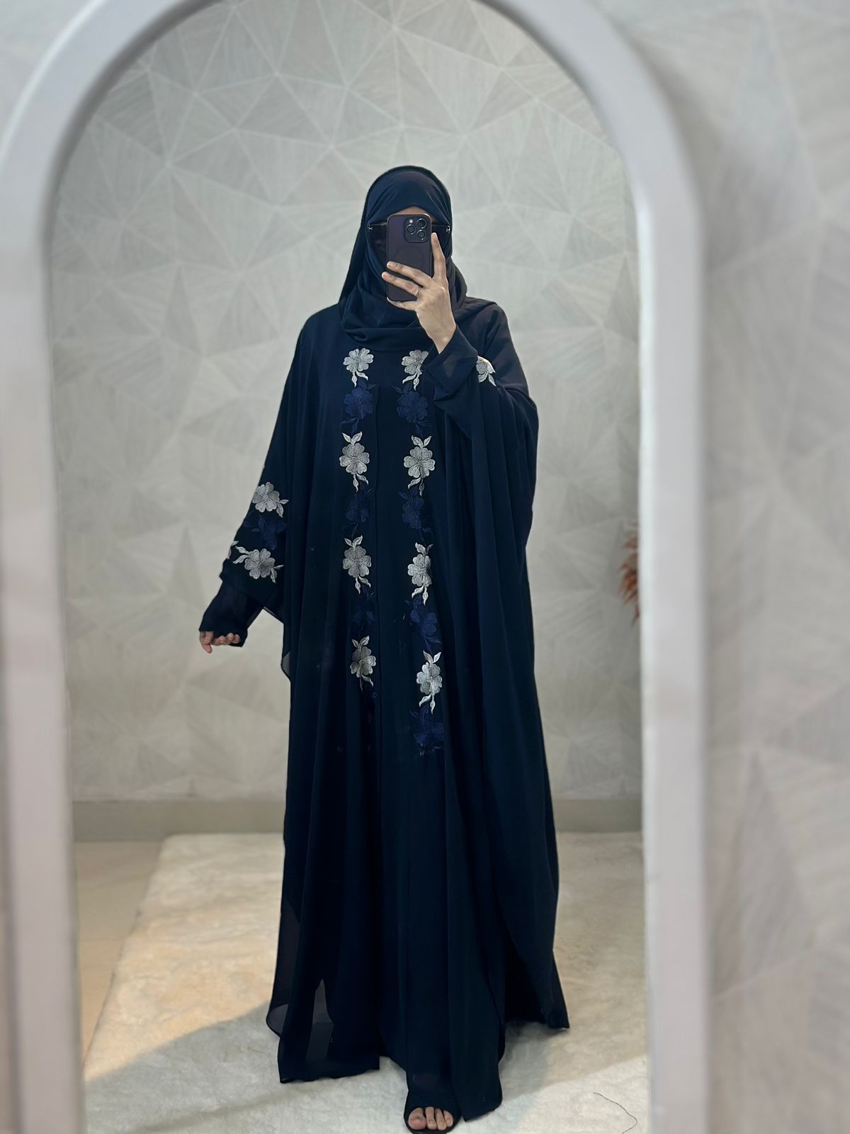 Indonesian Heavy Diamond Chiffon Navy Abaya Burqa - Floral Elegance and Dubai Style
